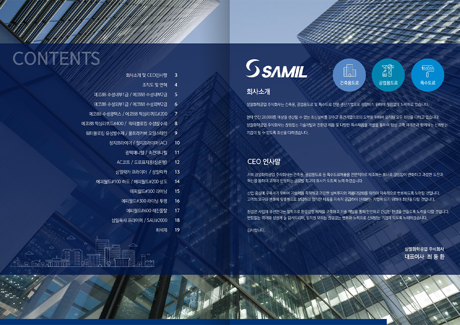건설, 산업 [카다로그] 삼일화학공업 페이지 정보 작성자 최고관리자 조회 3,468회 작성일 22-04-13 14:04 목록 [카다로그] 삼일화학공업 이전글[카다로그] 영주헌도예 22.04.13 다음글[카다로그] 디지털워터 22.04.13